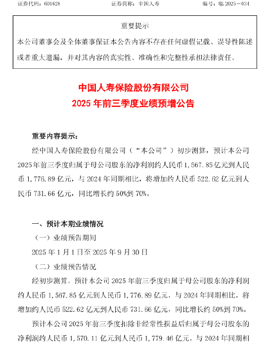 10月20日金融一线消息,中国人寿日前发布2025年前三季度业绩预增公告。经初步测算,2025年前三季度,中国人寿预计实现归属于母公司股东的净利润约1567.85亿元到1776.89亿元鼎冠策略,与2024年同期相比,将增加约522.62亿元到731.66亿元,同比增长约50%到70%。