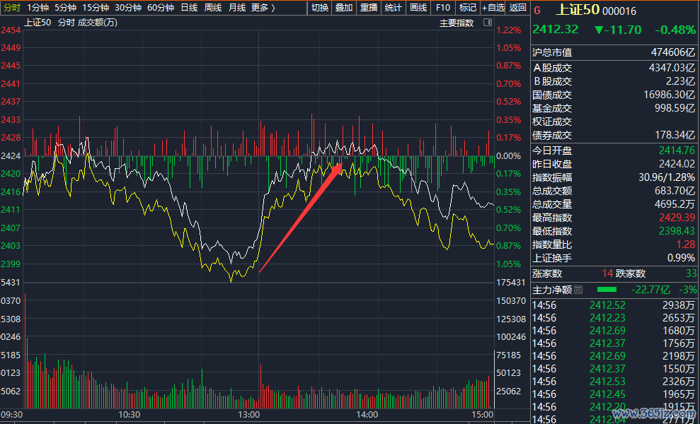 今日午后,A股一度出现异动,有不少资金抄底权重板块,上证50指数大幅拉升,午后20多分钟时间就翻红了,该指数早盘一度跌超1%。截至收盘时,上证50指数跌0.48%,沪指跌1.65%,深成指跌2.29%,创业板指跌1.97%。沪深两市全天成交额合计9471亿元,较上一交易日缩量500亿元。