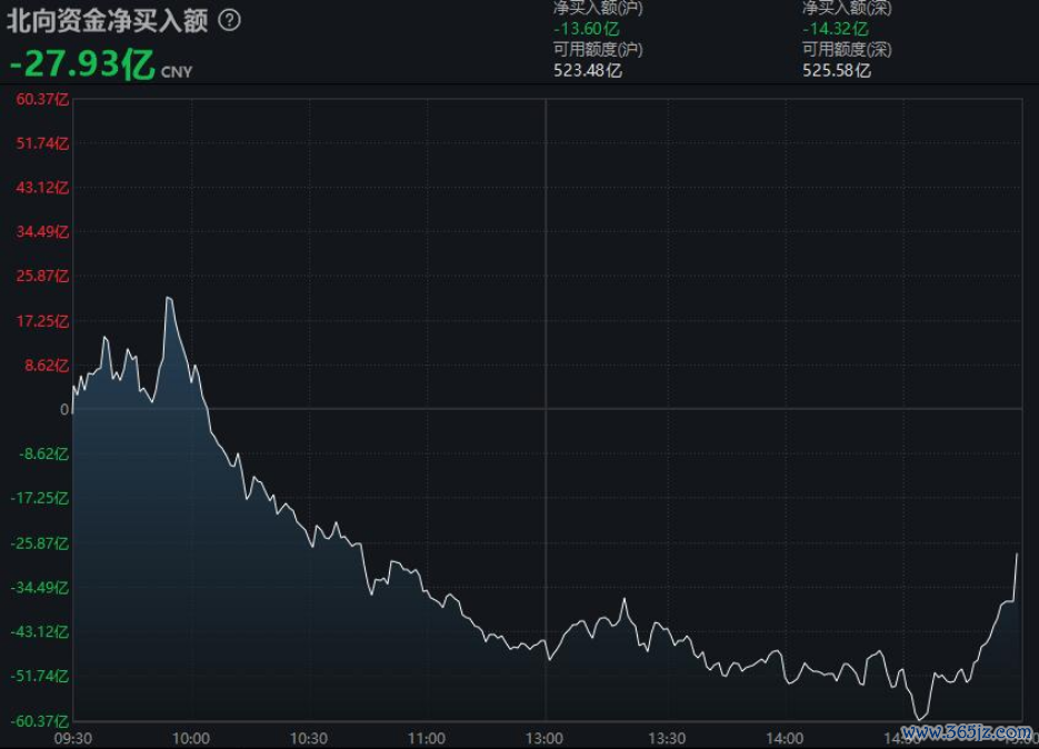 北向资金午后一度净卖出超60亿元,不过在尾盘30分钟回流超30亿元。最终,北向资金全天净卖出27.93亿元。其中,沪股通净卖出13.6亿元,深股通净卖出14.32亿元。